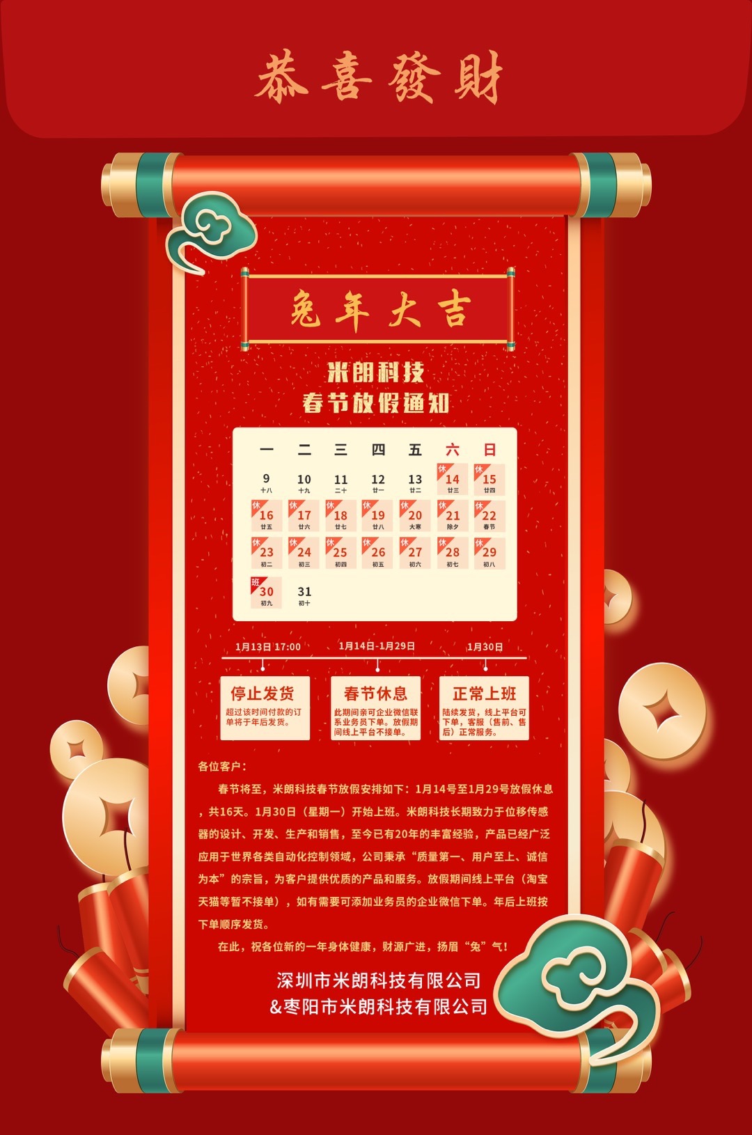 來源:MIRAN深圳市米朗科技有限公司2023年春節(jié)放假通知 發(fā)布于:2023-1-13 15:26:10 瀏覽:4034