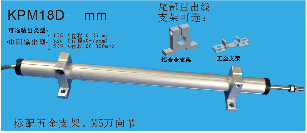KPM18小型絞接式位移傳感器外殼表面陽極處理,防腐蝕;內(nèi)置碳膜線板測(cè)量單元,壽命長(zhǎng),鋁管直徑18mm,是兩端固定安裝的微型絞接運(yùn)動(dòng)方式,適合于較小機(jī)械行程且有擺動(dòng)的位置檢測(cè).