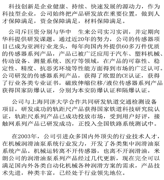 米朗公司長期致力于各類傳感器和集中潤滑油泵系統(tǒng)等領(lǐng)域的研發(fā)、生產(chǎn)、銷售。米朗MIRAN品牌系列產(chǎn)品廣泛應(yīng)用于國內(nèi)外各類自動(dòng)化控制和機(jī)械領(lǐng)域。主要產(chǎn)品有:電阻式位移傳感器(電子尺),磁阻式位移傳感器,磁柵式位移傳感器,拉繩式位移傳感器,磁致伸縮位移/液位傳感器,角度傳感器,傾角位移傳感器,LVDT差動(dòng)變壓位移傳感器,電渦流位移傳感器,超聲波位移傳感器,壓力傳感器,各種信號(hào)轉(zhuǎn)換模塊,顯示控制器,軌道交通測量產(chǎn)品。米朗集中潤滑油泵系統(tǒng)主要有干、稀油兩大系列各種潤滑方式的產(chǎn)品,產(chǎn)品廣泛用于:注塑機(jī)、壓鑄機(jī)、工程機(jī)械、數(shù)控機(jī)械、加工中心、電梯、生產(chǎn)線、機(jī)床、鍛造、鍛壓、紡織、塑料、木工、橡膠、礦山、治金、建筑、印刷、食品等各行業(yè)的機(jī)械設(shè)備的潤滑系統(tǒng)及汽車底盤集中潤滑系統(tǒng),公司潤滑油泵系統(tǒng)產(chǎn)品以其精巧的外觀和穩(wěn)定的品質(zhì),火熱銷往全國各地。