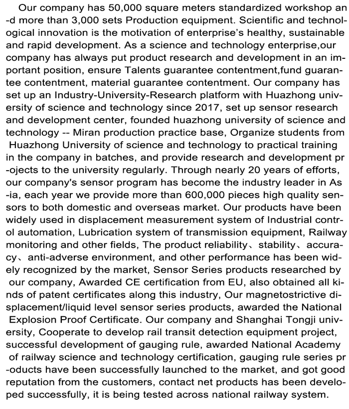 Our company has 50,000 square meters standardized workshop and more than 3,000 sets Production equipment. Scientific and technological innovation is the motivation of enterprise’s healthy, sustainable and rapid development. As a science and technology enterprise,our company has always put product research and development in an important position, ensure Talents guarantee contentment,fund guarantee contentment, material guarantee contentment. Our company has set up an Industry-University-Research platform with Huazhong university of science and technology since 2017, set up sensor research and development center, founded huazhong university of science and technology -- Miran production practice base, Organize students from Huazhong University of science and technology to practical training in the company in batches, and provide research and development projects to the university regularly. Through nearly 20 years of efforts, our company's sensor program has become the industry leader in Asia, each year we provide more than 600,000 pieces high quality sensors to both domestic and overseas market. Our products have been widely used in displacement measurement system of Industrial control automation, Lubrication system of transmission equipment, Railway monitoring and other fields, The product reliability、stability、accuracy、anti-adverse environment, and other performance has been widely recognized by the market, Sensor Series products researched by our company, Awarded CE certification from EU, also obtained all kinds of patent certificates along this industry, Our magnetostrictive displacement/liquid level sensor series products, awarded the National Explosion Proof Certificate. Our company and Shanghai Tongji university, Cooperate to develop rail transit detection equipment project, successful development of gauging rule, awarded National Academy of railway science and technology certification, gauging rule series products have been successfully launched to the market, and got good reputation from the customers, contact net products has been developed successfully, it is being tested across national railway system.
