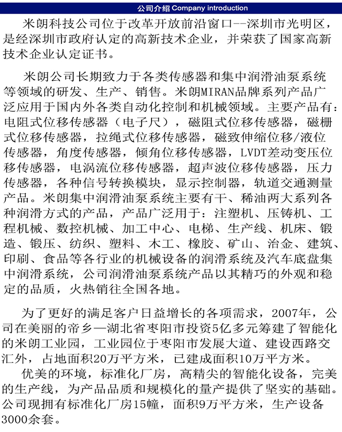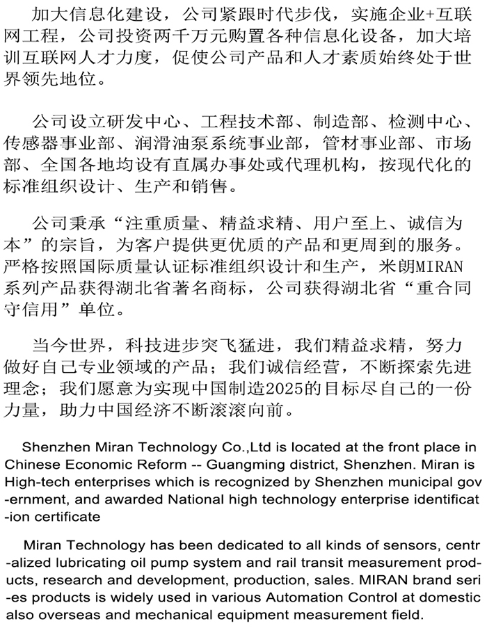 Miran Technology has been dedicated to all kinds of sensors, centralized lubricating oil pump system and rail transit measurement products, research and development, production, sales. MIRAN brand series products is widely used in various Automation Control at domestic also overseas and mechanical equipment measurement field.