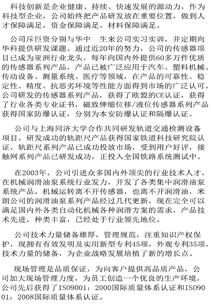 Our company has 50,000 square meters standardized workshop and more than 3,000 sets Production equipment. Scientific and technological innovation is the motivation of enterprise’s healthy, sustainable and rapid development. As a science and technology enterprise,our company has always put product research and development in an important position, ensure Talents guarantee contentment,fund guarantee contentment, material guarantee contentment. Our company has set up an Industry-University-Research platform with Huazhong university of science and technology since 2017, set up sensor research and development center, founded huazhong university of science and technology -- Miran production practice base, Organize students from Huazhong University of science and technology to practical training in the company in batches, and provide research and development projects to the university regularly. Through nearly 20 years of efforts, our company's sensor program has become the industry leader in Asia, each year we provide more than 600,000 pieces high quality sensors to both domestic and overseas market. Our products have been widely used in displacement measurement system of Industrial control automation, Lubrication system of transmission equipment, Railway monitoring and other fields, The product reliability、stability、accuracy、anti-adverse environment, and other performance has been widely recognized by the market, Sensor Series products researched by our company, Awarded CE certification from EU, also obtained all kinds of patent certificates along this industry, Our magnetostrictive displacement/liquid level sensor series products, awarded the National Explosion Proof Certificate. Our company and Shanghai Tongji university, Cooperate to develop rail transit detection equipment project, successful development of gauging rule, awarded National Academy of railway science and technology certification, gauging rule series products have been successfully launched to the market, and got good reputation from the customers, contact net products has been developed successfully, it is being tested across national railway system.