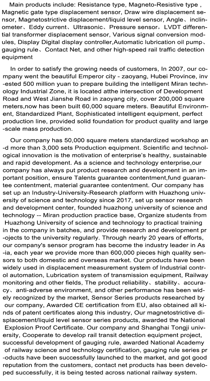 Main products include: Resistance type, Magneto-Resistive type , Magnetic gate type displacement sensor, Draw wire displacement sensor, Magnetostrictive displacement/liquid level sensor, Angle、inclinometer、Eddy current、Ultrasonic、Pressure sensor,LVDT differential transformer displacement sensor, Various signal conversion modules, Display Digital display controller,Automatic lubrication oil pump、gauging rule、Contact Net, and other high-speed rail traffic detection equipment