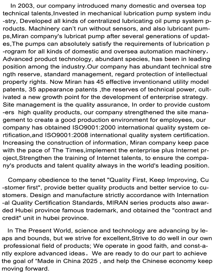 In 2003, our company introduced many domestic and oversea top technical talents,Invested in mechanical lubrication pump system industry, Developed all kinds of centralized lubricating oil pump system products. Machinery can’t run without sensors, and also lubricant pumps,Miran company's lubricat pump after several generations of updates,The pumps can absolutely satisfy the requirements of lubrication program for all kinds of domestic and oversea automation machinery,Advanced product technology, abundant species, has been in leading position among the industry.Our company has abundant technical strength reserve, standard management, regard protection of intellectual property rights. Now Miran has 45 effective invention and utility model patents, 35 appearance patents ,the reserves of technical power, cultivated a new growth point for the development of enterprise strategy. Site management is the quality assurance, In order to provide customers high quality products, our company strengthened the site management to create a good production environment for employees, our company has obtained ISO9001:2000 international quality system certification, and ISO9001:2008 international quality system certification.Increasing the construction of information, Miran company keep pace with the pace of The Times,implement the enterprise plus Internet project,Strengthen the training of Internet talents, to ensure the company's products and talent quality always in the world's leading position.