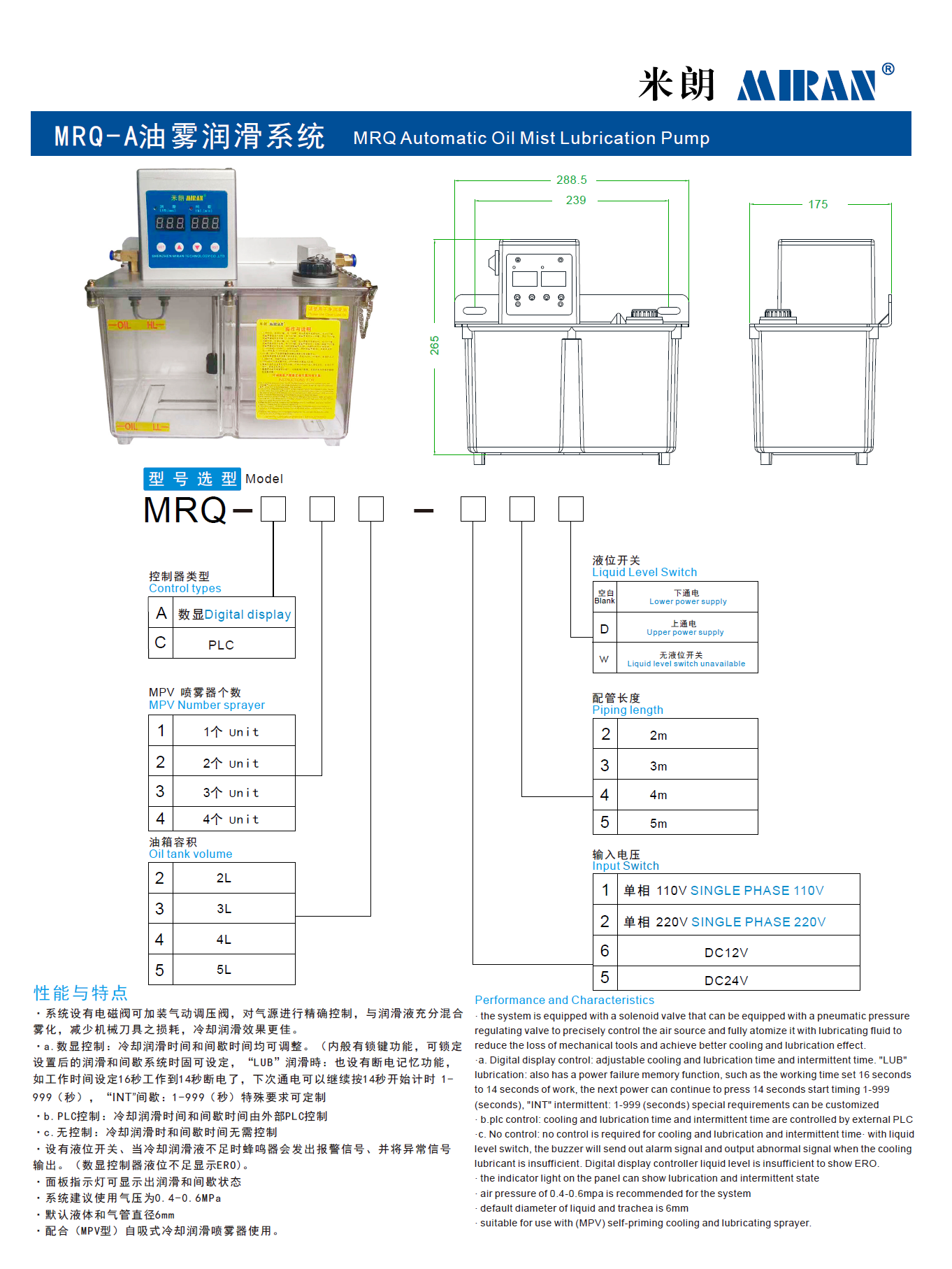 性能與特點(diǎn) ·系統(tǒng)設(shè)有電磁閥可加裝氣動(dòng)調(diào)壓閥,對(duì)氣源進(jìn)行精確控制,與潤(rùn)滑液充分混合霧化,減少機(jī)械刀具之損耗,冷卻潤(rùn)滑效果更佳。 ·a .數(shù)顯控制:冷卻潤(rùn)滑時(shí)間和間歇時(shí)間均可調(diào)整。(內(nèi)般有鎖鍵功能,可鎖定設(shè)置后的潤(rùn)滑和間歇系統(tǒng)時(shí)固可設(shè)定,“L U B”潤(rùn)滑時(shí):也設(shè)有斷電記憶功能,如工作時(shí)間設(shè)定1 6秒工作到1 4秒斷電了,下次通電可以繼續(xù)按1 4秒開始計(jì)時(shí) 1 -9 9 9(秒),“INT”間歇:1 - 9 9 9(秒)特殊要求可定制 ·b . P L C控制:冷卻潤(rùn)滑時(shí)間和間歇時(shí)間由外部P L C控制 ·c .無(wú)控制:冷卻潤(rùn)滑時(shí)和間歇時(shí)間無(wú)需控制 ·設(shè)有液位開關(guān)、當(dāng)冷卻潤(rùn)滑液不足時(shí)蜂鳴器會(huì)發(fā)出報(bào)警信號(hào)、并將異常信號(hào)輸出。(數(shù)顯控制器液位不足顯示E R O )。 ·面板指示燈可顯示出潤(rùn)滑和間歇狀態(tài) ·系統(tǒng)建議使用氣壓為0 . 4 - 0 . 6 M P a ·默認(rèn)液體和氣管直徑6 m m ·配合(M P V型)自吸式冷卻潤(rùn)滑噴霧器使用。