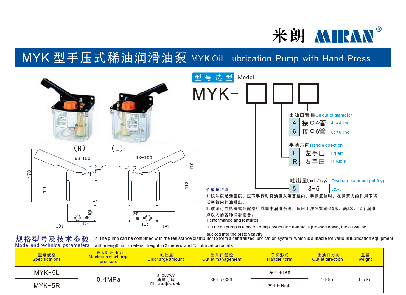 Performance and features: 1. The oil pump is a piston pump. When the handle is pressed down, the oil will be sucked into the piston cavity. 2. The pump can be combined with the resistance distributor to form a centralized lubrication system, which is suitable for various lubrication equipment within length in 5 meters , height in 3 meters and 15 lubrication points.