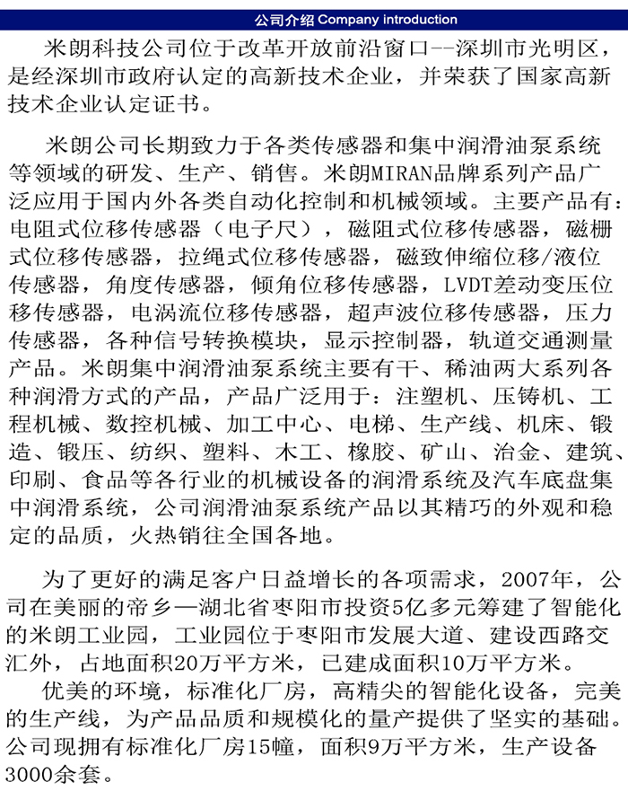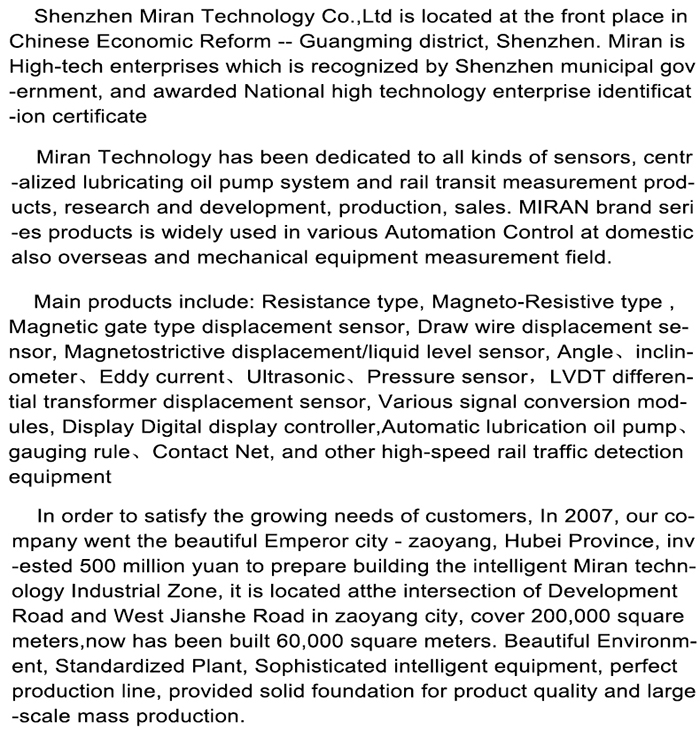 Miran Technology has been dedicated to all kinds of sensors, centralized lubricating oil pump system and rail transit measurement products, research and development, production, sales. MIRAN brand series products is widely used in various Automation Control at domestic also overseas and mechanical equipment measurement field.