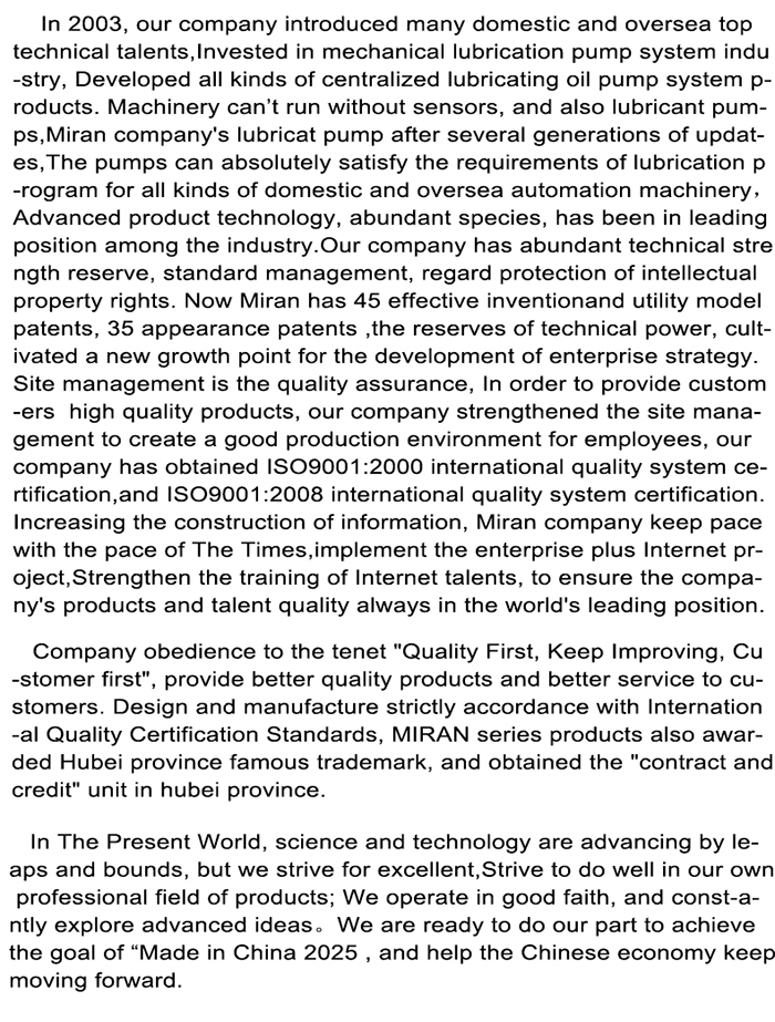 In 2003, our company introduced many domestic and oversea top technical talents,Invested in mechanical lubrication pump system industry, Developed all kinds of centralized lubricating oil pump system products. Machinery can’t run without sensors, and also lubricant pumps,Miran company's lubricat pump after several generations of updates,The pumps can absolutely satisfy the requirements of lubrication program for all kinds of domestic and oversea automation machinery,Advanced product technology, abundant species, has been in leading position among the industry.Our company has abundant technical strength reserve, standard management, regard protection of intellectual property rights. Now Miran has 45 effective invention and utility model patents, 35 appearance patents ,the reserves of technical power, cultivated a new growth point for the development of enterprise strategy. Site management is the quality assurance, In order to provide customers high quality products, our company strengthened the site management to create a good production environment for employees, our company has obtained ISO9001:2000 international quality system certification, and ISO9001:2008 international quality system certification.Increasing the construction of information, Miran company keep pace with the pace of The Times,implement the enterprise plus Internet project,Strengthen the training of Internet talents, to ensure the company's products and talent quality always in the world's leading position.