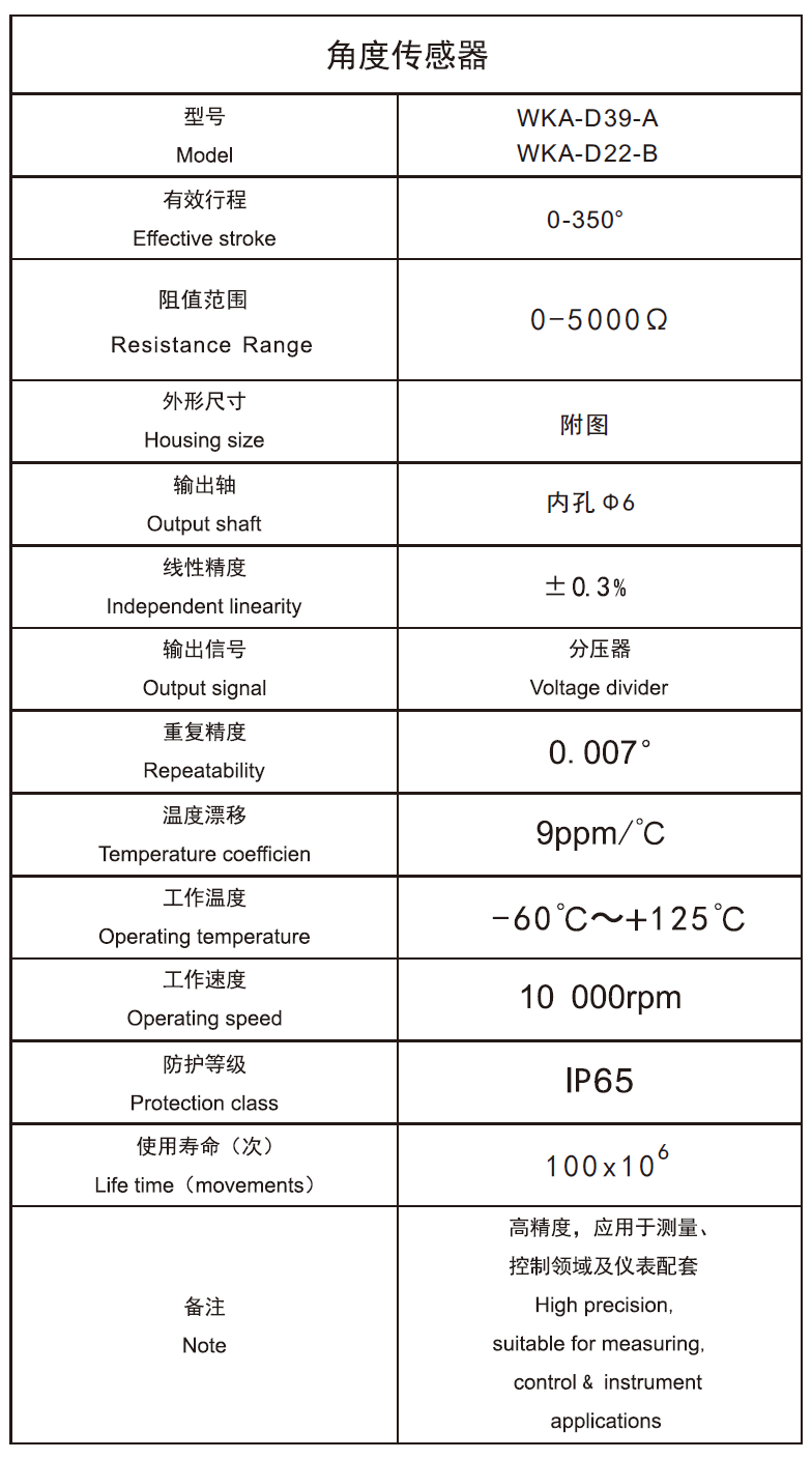 WKA-D系列顯著特點包括:作為一種高精密角度位移傳感器,它既合適各種模擬量輸出的應(yīng)用,又能兼具數(shù)字信號輸出應(yīng)用,比如,如果它同時和A/D變換器配合使用,則構(gòu)成性價比極高的數(shù)字型絕對值編碼器,可用于精確定位/塑料電阻式精密電位計。位置檢測等。