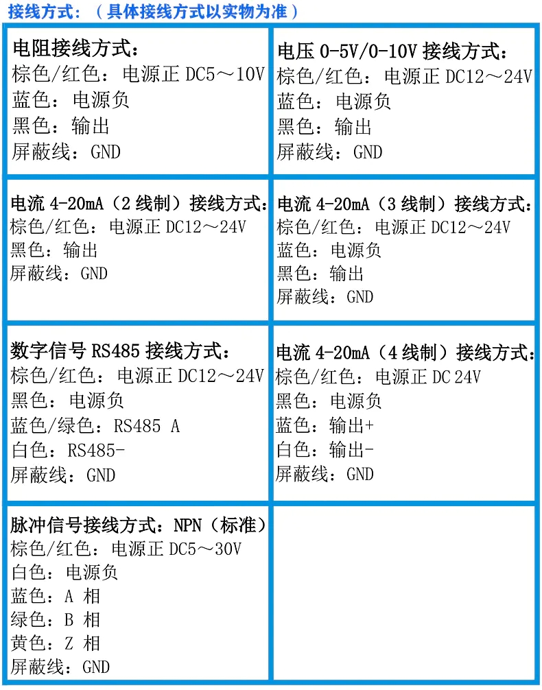 電阻輸出型:5kΩ, 數(shù)字信號(hào)輸出型:RS485, 脈沖輸出型:A B Z |