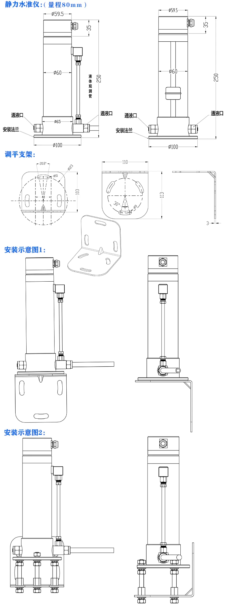 磁致伸縮式靜力水準儀是一種高精密液位測量儀器,由一個高精度的磁致伸縮液位計加上儲液罐,液位浮球,調(diào)平支架,水管等部件構(gòu)成。在使用中,多個靜力水準儀的容器用通液管聯(lián)接,每一容器的液位由相關(guān)傳感器測出,進而可測出各測點的液位變化量。
