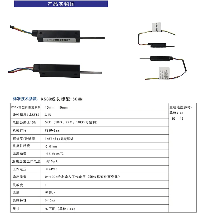 KS8X微型自復(fù)位式位移傳感器(別名:電子尺,電阻尺,電位器,直線位移傳感器)原理:電位計原理,所有傳感器為位置測量型,用于調(diào)節(jié)系統(tǒng)(控制系統(tǒng))和測量系統(tǒng)中,對位移和長度進(jìn)行直接測量,輸出直流電壓信號,也可以通過內(nèi)置或者外置的V/A變送模塊將信號轉(zhuǎn)換成標(biāo)準(zhǔn)的0-5V、0-10V或者4-20mA直流信號,也可以遠(yuǎn)距離傳輸控制要求。KS8X微型自復(fù)位式位移傳感器(別名:電子尺,電阻尺,電位器,直線位移傳感器)輸出位移變化:0-100%給定輸入工作電壓(隨位移變化而變化)。