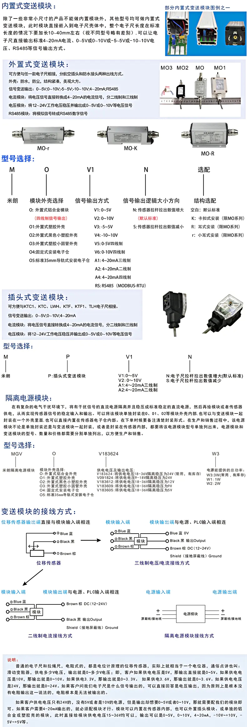 如果供電電壓只有24V的,沒有5V或者是10V的電源,但是輸出卻想要0-5V或者0-10V,那就需要配我們的模塊即可。如果需要4-20MA或者RS485輸出的,就必須配模塊才行。模塊可以內(nèi)置在傳感器內(nèi)部,也可以外置插頭模塊(限模擬量信號輸出)、或單獨(dú)的鋁合金或塑膠殼的模塊。