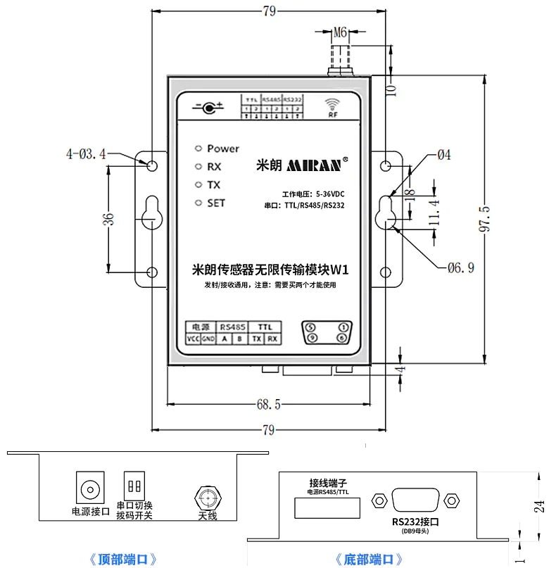 三、米朗傳感器無線傳輸模塊W1/無線數(shù)傳電臺技術參數(shù):