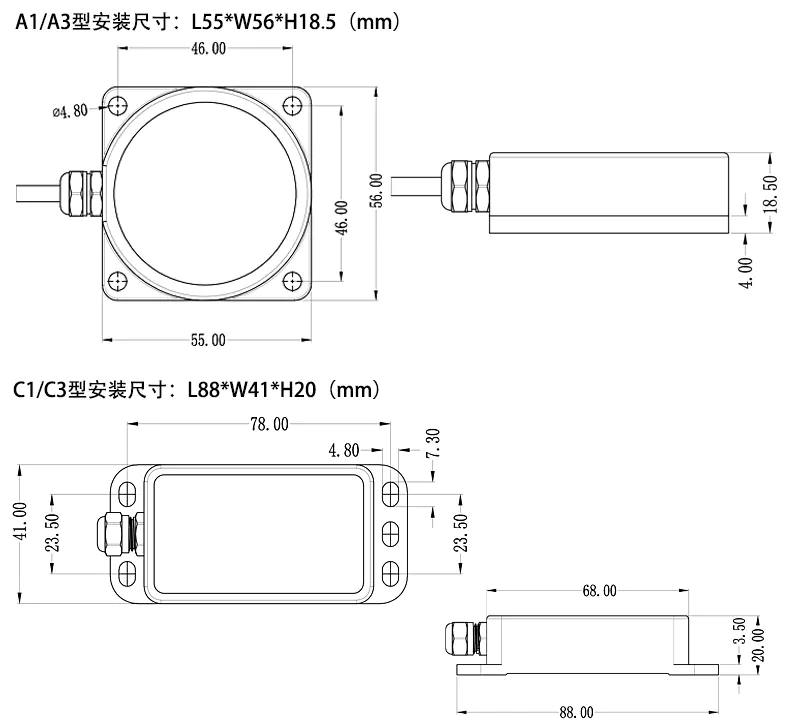 四、六軸(姿態(tài))傾角(動(dòng)態(tài))傳感器安裝尺寸: