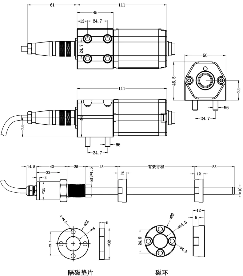 MFTS1分體式磁致伸縮位移傳感器安裝尺寸圖: