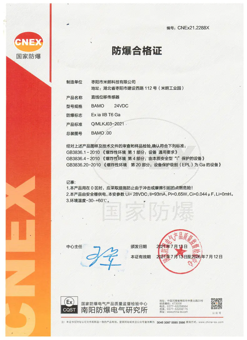 位移傳感器(本安型)防爆型證書(shū)