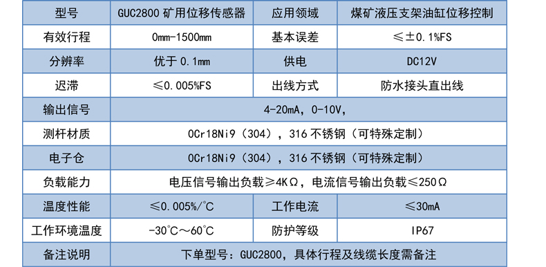 二、GUC2800礦用本安磁致伸縮位移傳感器技術(shù)參數(shù):